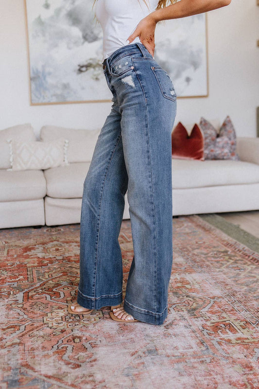 Judy Blue High Rise Distressed Straight Jeans in Bone
