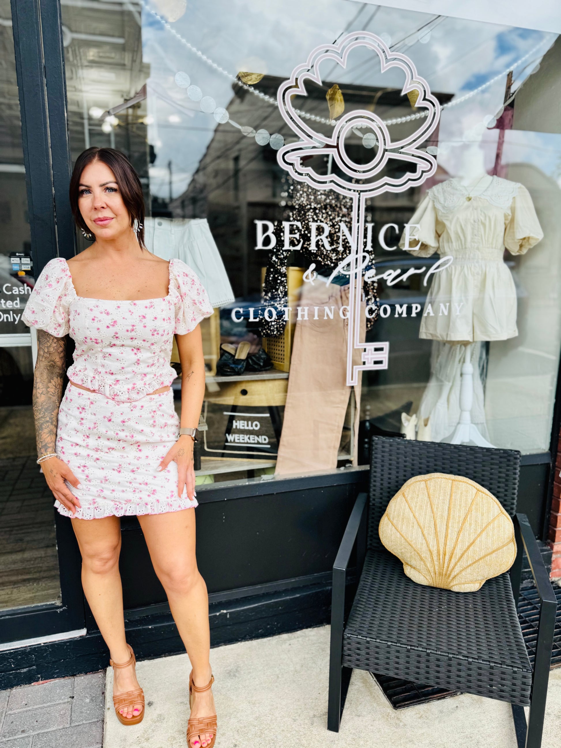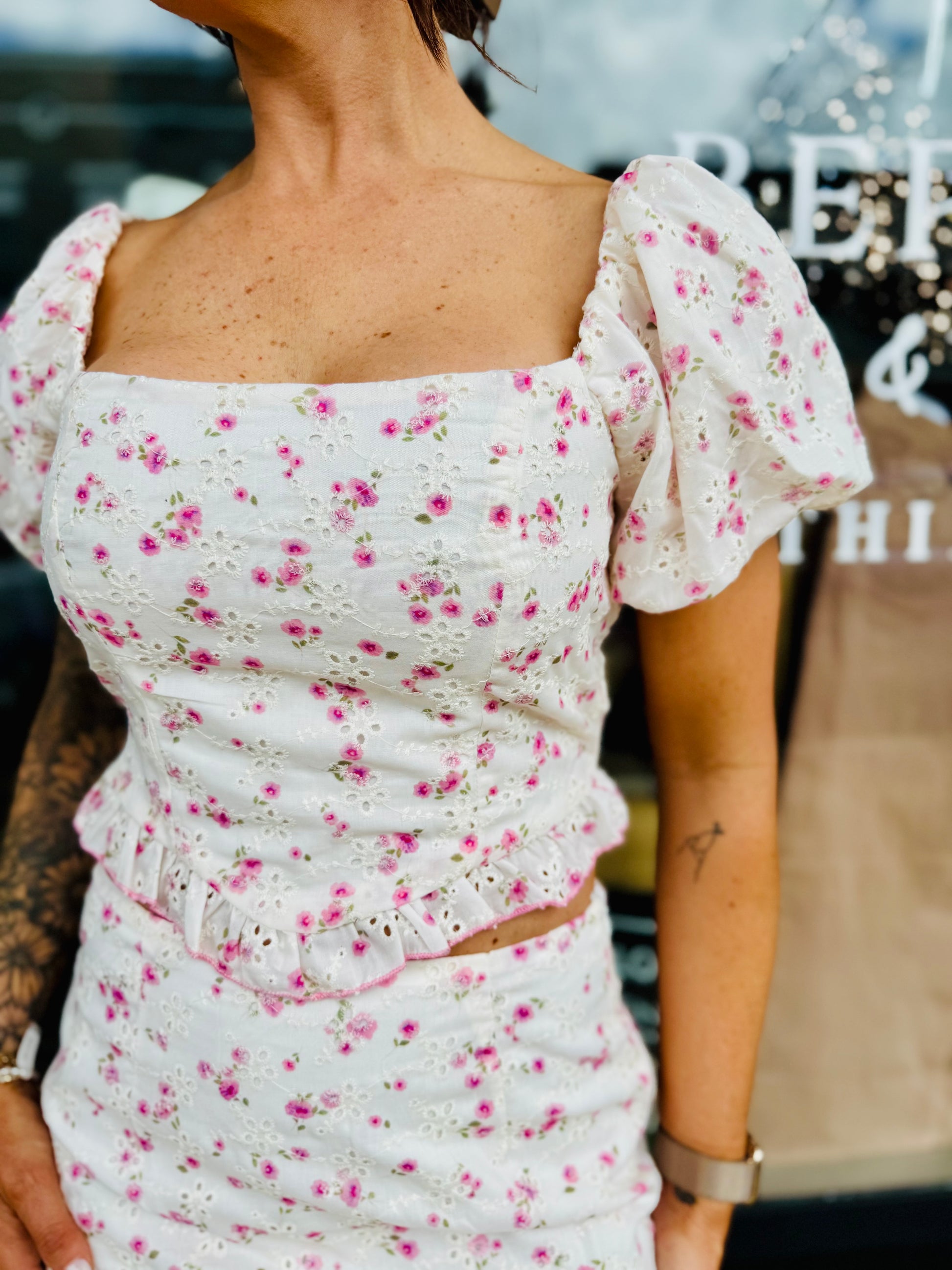 The Everly eyelet skirt features delicate ivory and pink floral embroidery on breathable fabric, enhanced by a charming ruffle hem that adds subtle movement and femininity. Expertly crafted, this skirt combines classic elegance with a fresh, romantic touch, making it a versatile piece for both casual and dressier occasions. Check out the coordinating top!